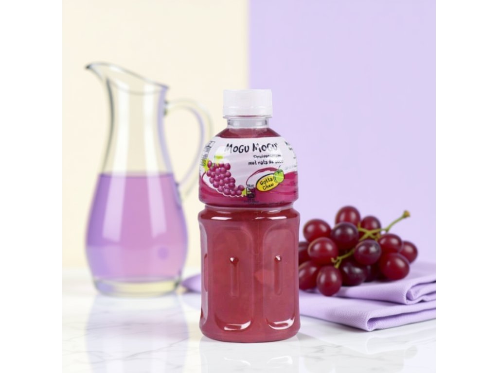 Osvěžující hroznový nápoj MOGU MOGU s kousky kokosového želé (Nata de Coco) nabízí sladkou ovocnou chuť a jedinečný žvýkací zážitek. Ideální pro rychlé osvěžení během dne.